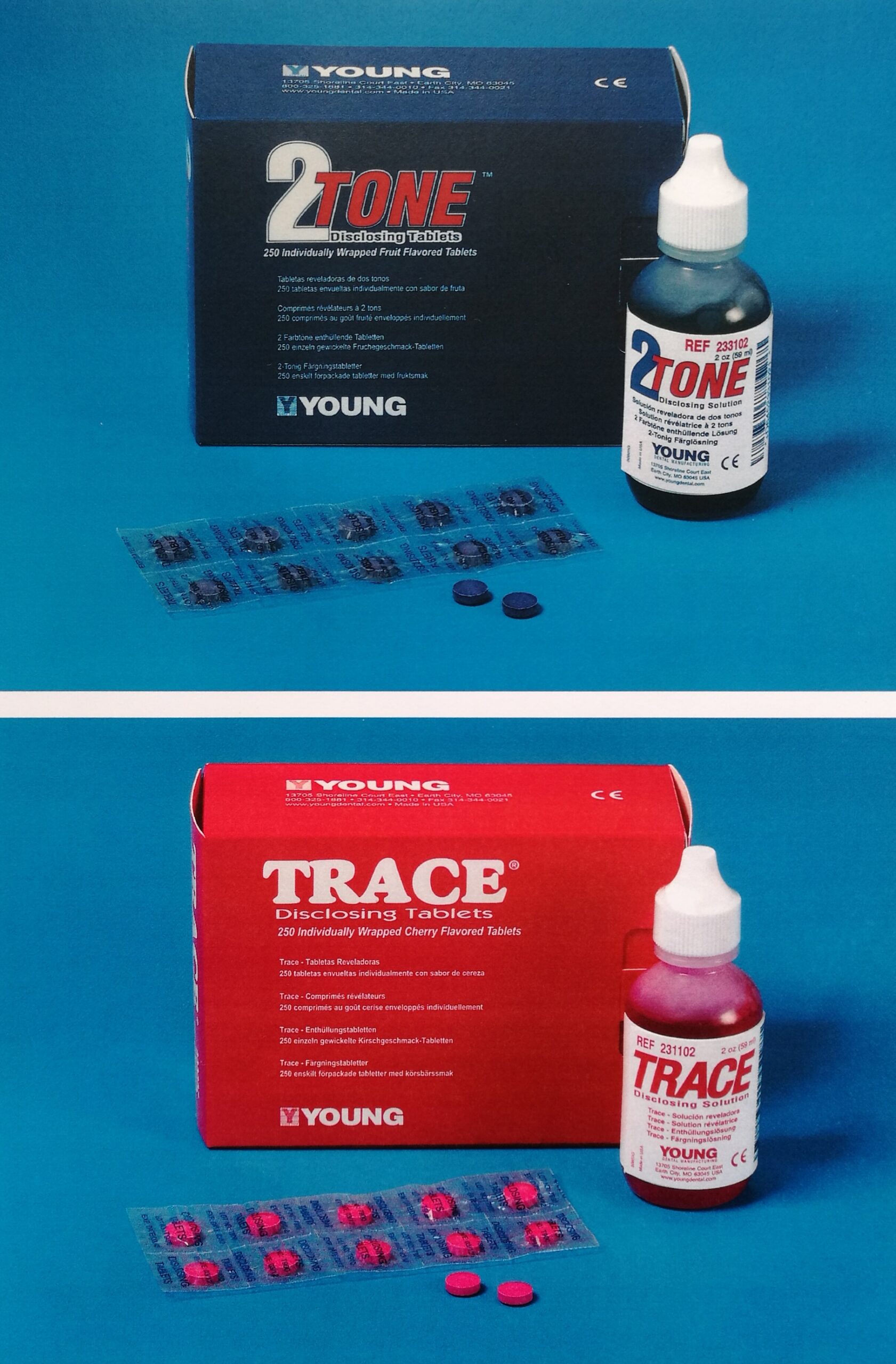 2-Tone: Tweekleurige tandplakverklikker, blauw voor het lokaliseren van de oude tandplak, rood voor de recente tandplak. Fruitsmaak.